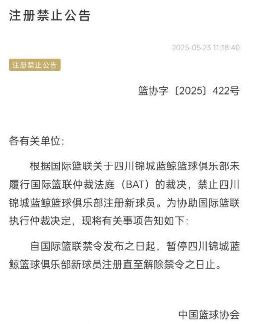 CBA 四川男篮出大事啦!中国篮协发了公告,说四川男篮因为没履行国际篮联仲裁法庭的裁决,被禁止注册新球员,啥时候禁令解除,啥时候才能再注册。